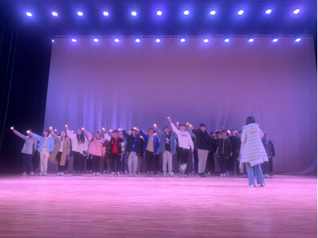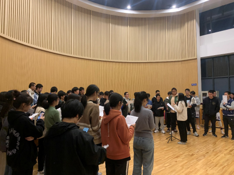 通过与指导老师的反复沟通,选定《夜空中最亮的星》作为建团的第一首排练曲目。在本学期四次排练中,同学们先后完成了发声呼吸训练、熟悉曲目、划分声部、分组训练、集体合练、动作编排、合练录制等课目,初步掌握了该曲目的表演技巧,大家不仅从中领略到了合唱艺术之美,还在各声部的相互配合、共同演唱的过程中更加深刻地体会到团队协作的重要意义。